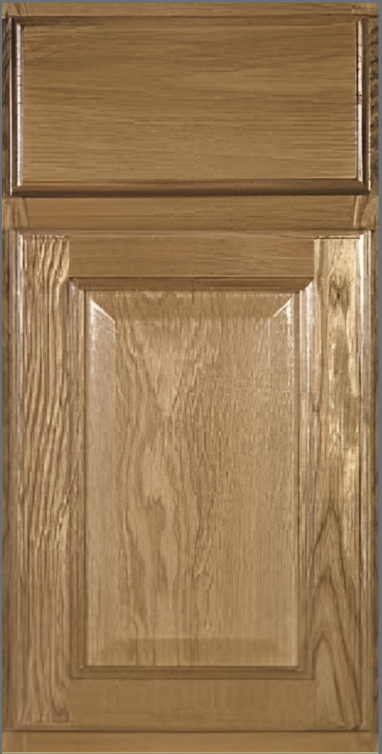 - Door: A standard reveals 5 pieces solid wood with a raised panel MDF veneer center panel Mortise and Tenon construction, slab drawer front, Oak wood in a Honey finish.