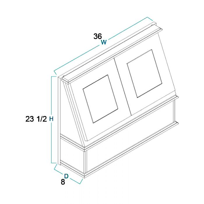 Range Hood Front – 36″W X 23 1/2″ H X 8″D – mounts between wall cabinets