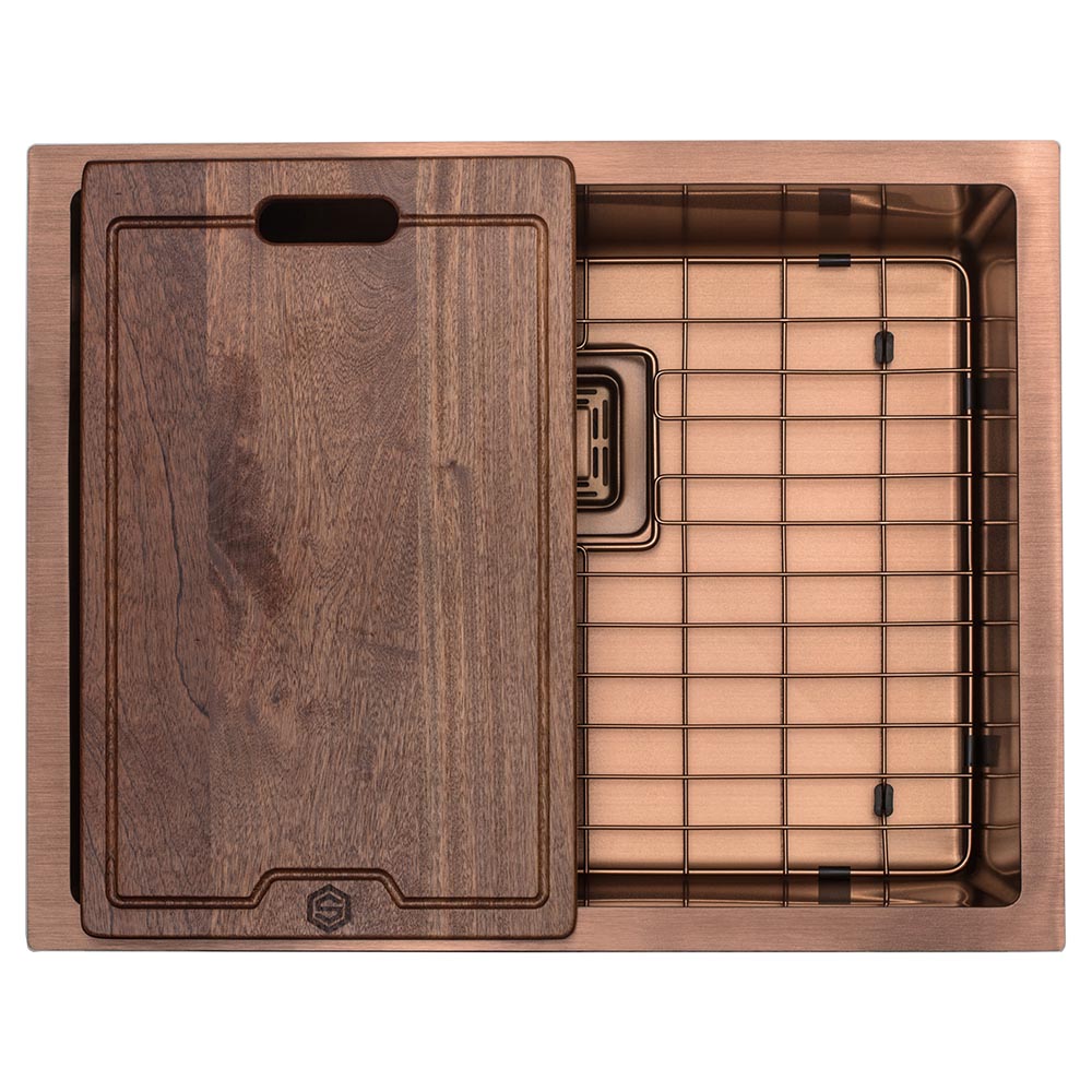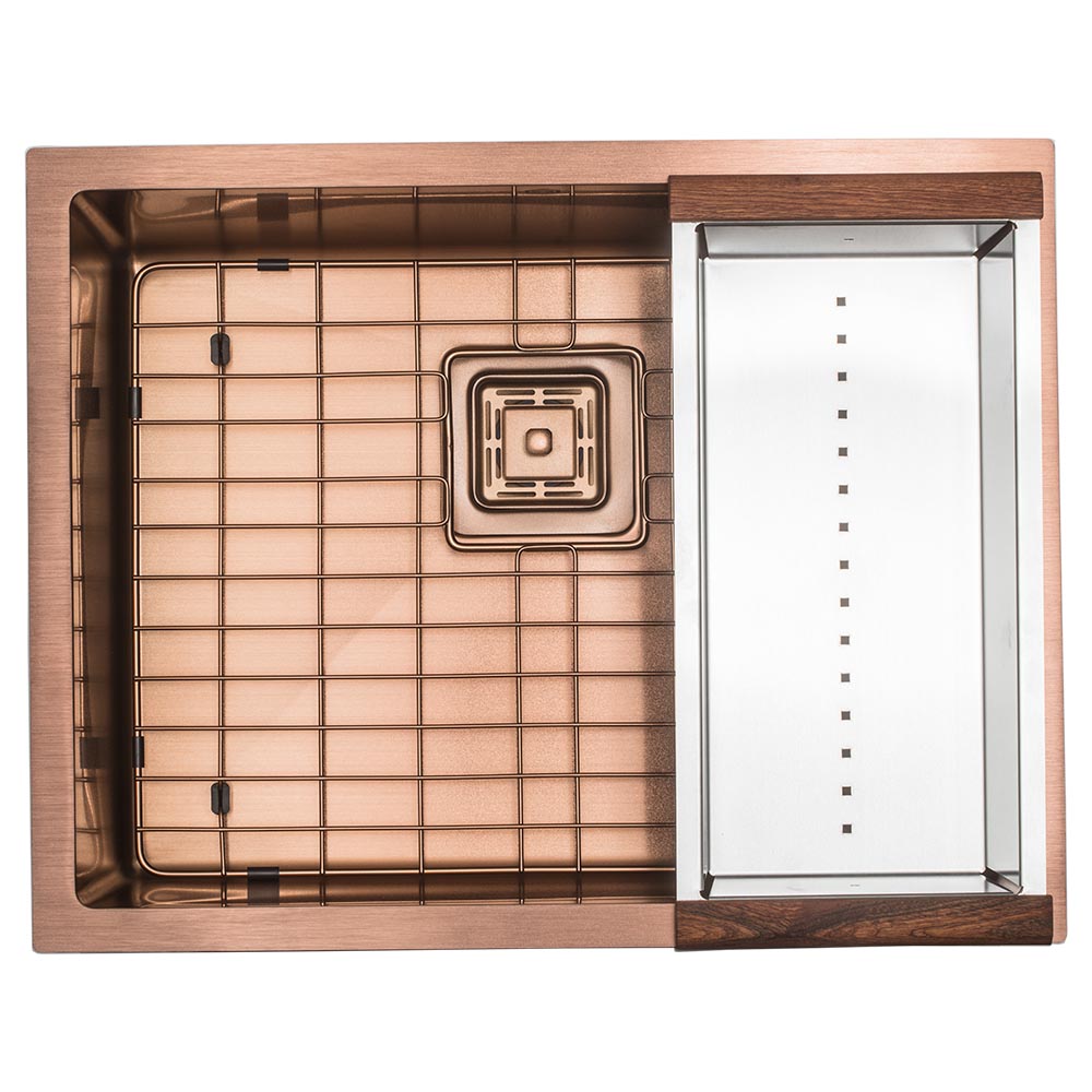 The R 21 Copper is part of our new product line. Its sleek design with a square drain, 9″ depth and brushed copper finish makes it a favorite for designers and home owners who are remodeling a kitchen. The copper finish offers a stain resistant, scratch resistant and liquid repellant surface. It is hand crafted from 16 gauge 304 grade stainless steel. The overall dimensions of the R 21 Copper are 23” x 18” x 9” and a minimum cabinet size of 24” is required. The cutout template, square garbage disposal adapter (color matching), are included with the purchase. As always our stainless steel products are covered under a limited lifetime warranty.